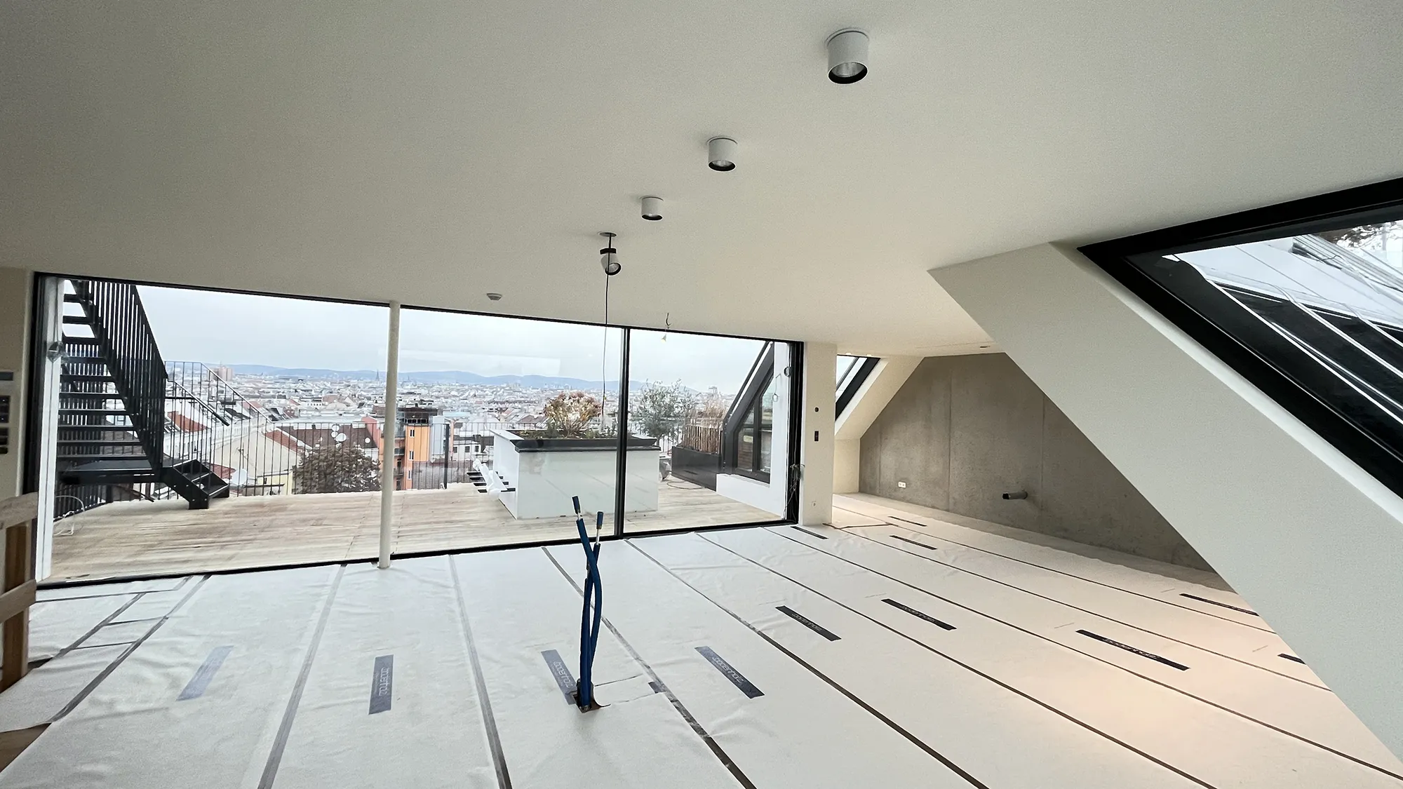Um so mehr freut es uns anhand des Projektes im fünften Wiener Gemeindebezirk zu demonstrieren, dass Flächenkühlung im Dachgeschoss mit abaton paneel hervorragend funktioniert. Die Kühldecke im sanierten Gründerzeithaus wird mit minimal 14°C betrieben, hat eine Belegungsfläche von knapp 60% der Raumfläche und deckt die gesamte Kühlast ab. Im nächtlichen Regenerationszyklus wird die Kühldecke mit Temperaturen über dem Taupunkt (22°C VL) betrieben, aber nicht ausgeschaltet und kühlt weiter. Die Ventilation der Räume erfolgt mit einem Lüftungsgerät mit Sorptionsrotor zur Feuchterückgewinnung, jedoch ohne aktive Entfeuchtung über ein Kühlregister.