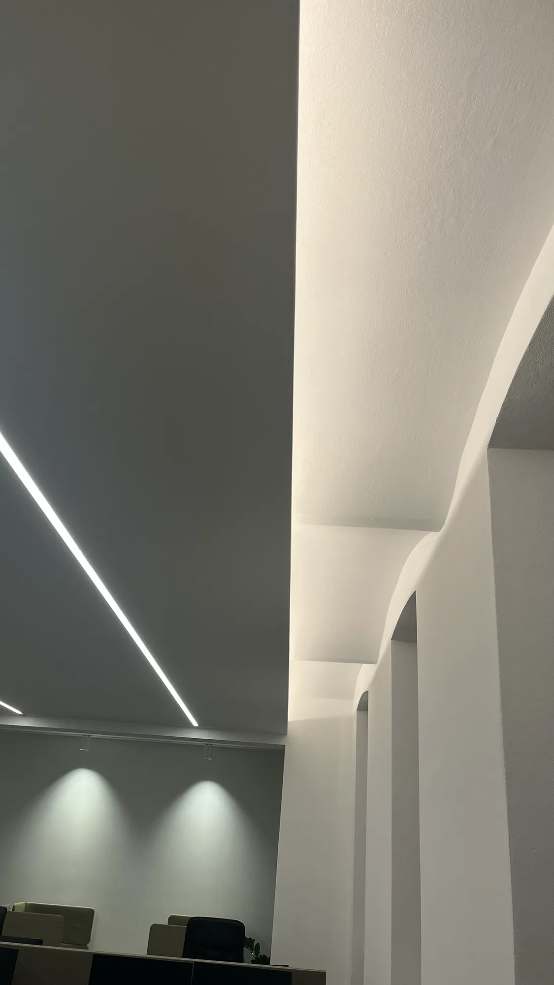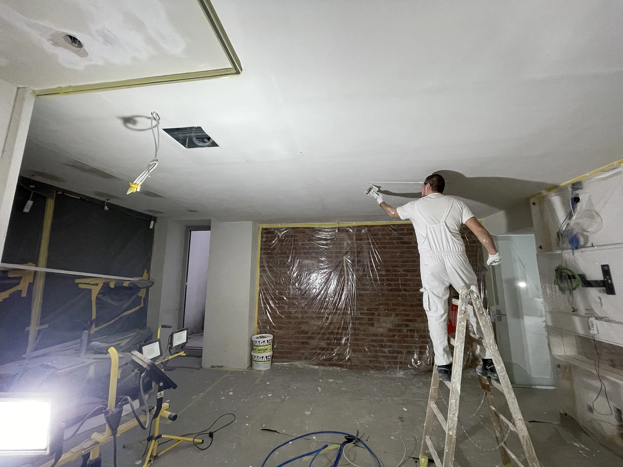 In Kombination mit einer kontrollierten Lüftungsanlage kann trotz hoher Belegungsdichte ein behagliches Raumklima für 15 MitarbeiterInnen garantiert werden. Verschiedene Beleuchtungslösungen für Arbeitsplätze, Fokusbereich, Besprechungsraum und Musterraum wurden in der Decke integriert. Das Büro befindet sich in einem umfassend ökologisch sanierten Gründerzeithaus.